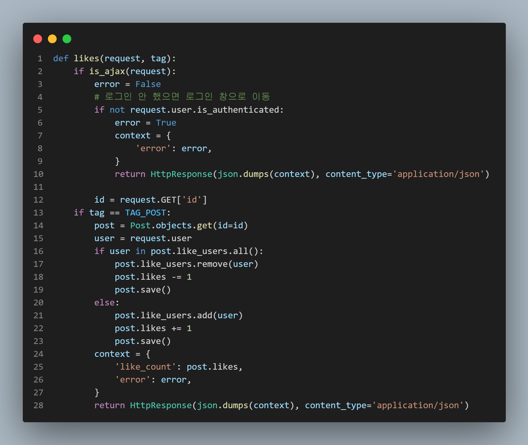 백엔드팀이다 보니 자바스크립트는 정말 할 줄 몰라서 열심히 구글링을 했다. ajax는 옛날 유행이라고 들은 것 같지만 참고할 자료가 많아서 ajax를 활용했다. 지금은 좋아요를 누르면 옆의 숫자가 바뀌는 형식인데, 추후에 프론트팀에서 하트의 색깔을 바꾸는 형식으로 수정할 예정이다.