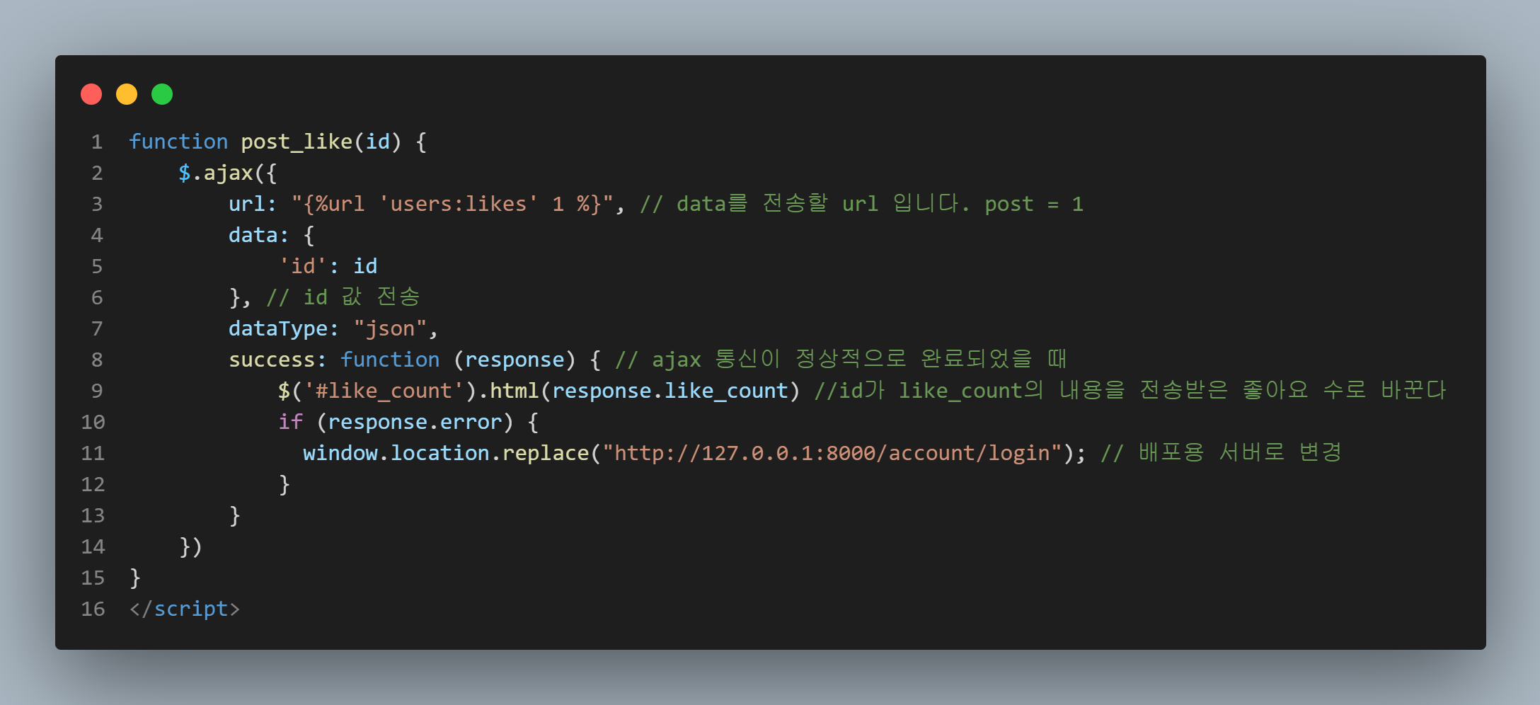 좋아요 기능은 ajax를 이용한 비동기 방식으로 구현했다.