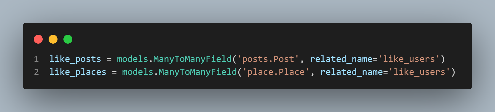 related_name도 필수로 설정해주어야 한다. Post에는 이미 작성자 정보를 가져오기 위해 User가 연결되어있다. 여기서 좋아요 누른 유저를 저장하기 위해 User를 다시 연결했는데 related_name을 설정하지 않으면 역참조 시 어떤 user를 말하는 것인지 알 수가 없다. 그러므로 related_name을 설정해서 정확히 표기해주어야한다.