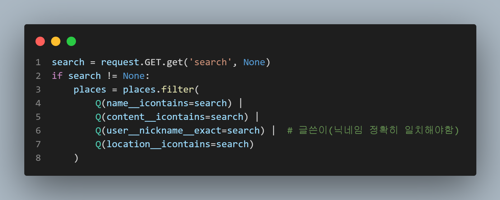 플레이스를 기준으로 장소의 이름과 내용, 위치는 icontains로 일부만 겹쳐도 검색되도록 구현했고 글쓴이 닉네임은 정확히 일치해야 검색되도록 만들었다.