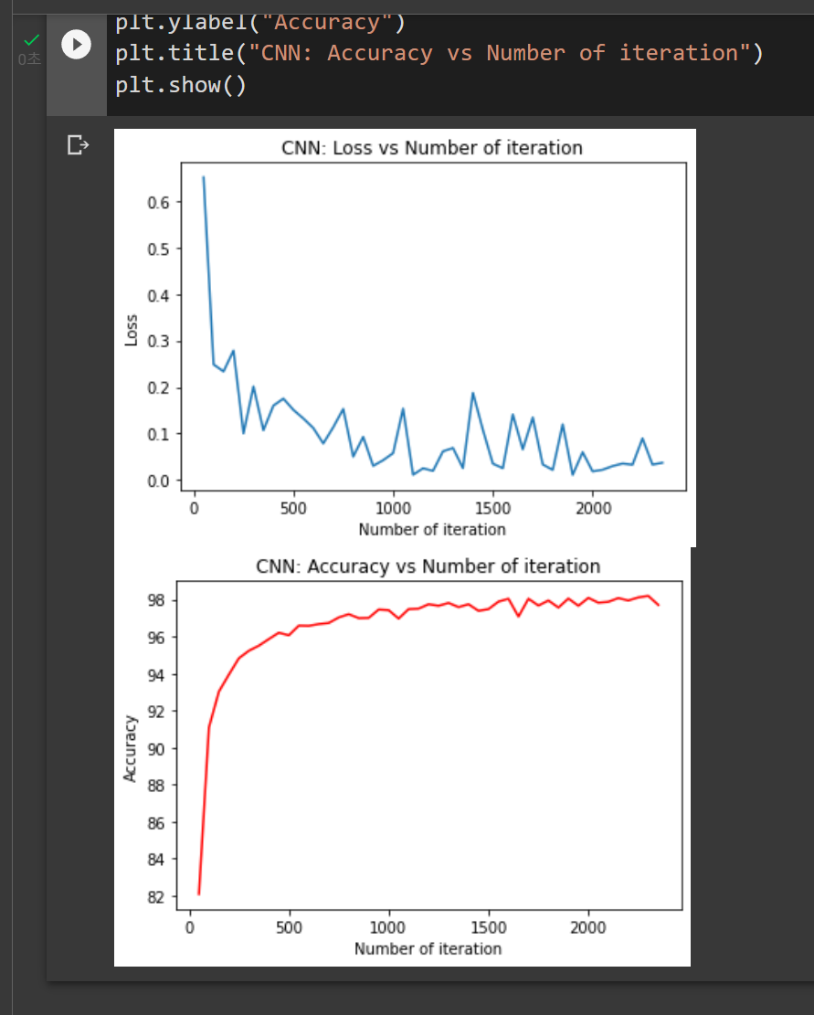 2000번의 반복만에 98%라는 높은 정확도를 보인다! ANN보다 더 좋은 성능을 보인다. 하지만 학습시간은 훨씬 더 오래 걸렸다.