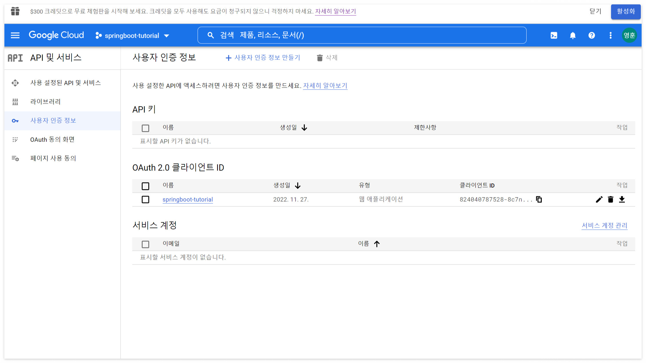 사용자 인증 정보 만들기를 클릭해서 필요한 정보들을 입력하면 다음과 같이 클라이언트 ID가 생성된다.