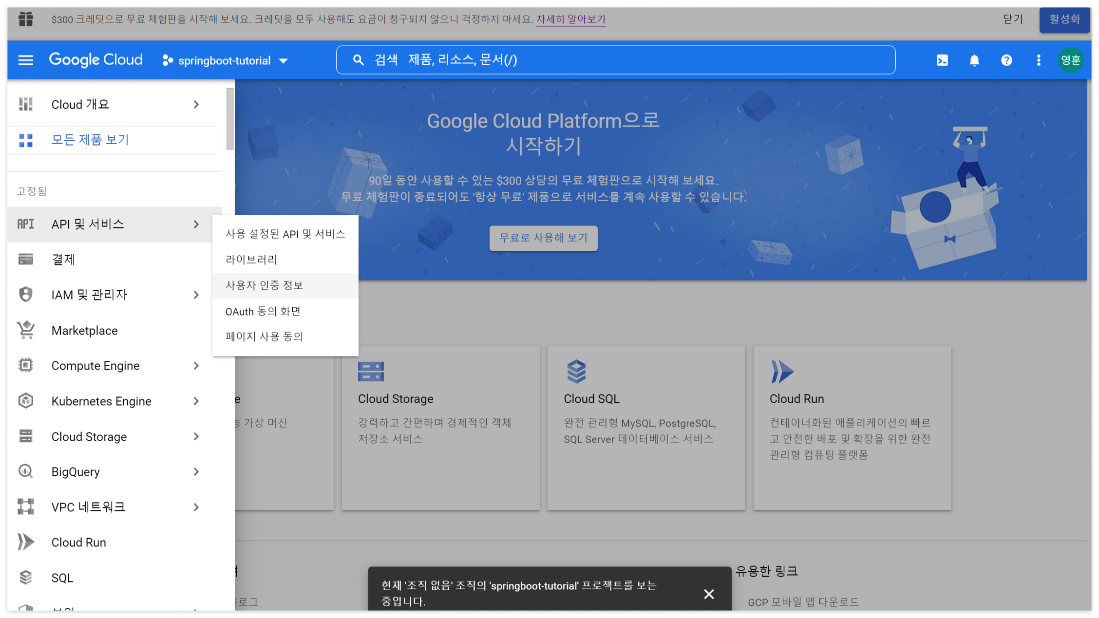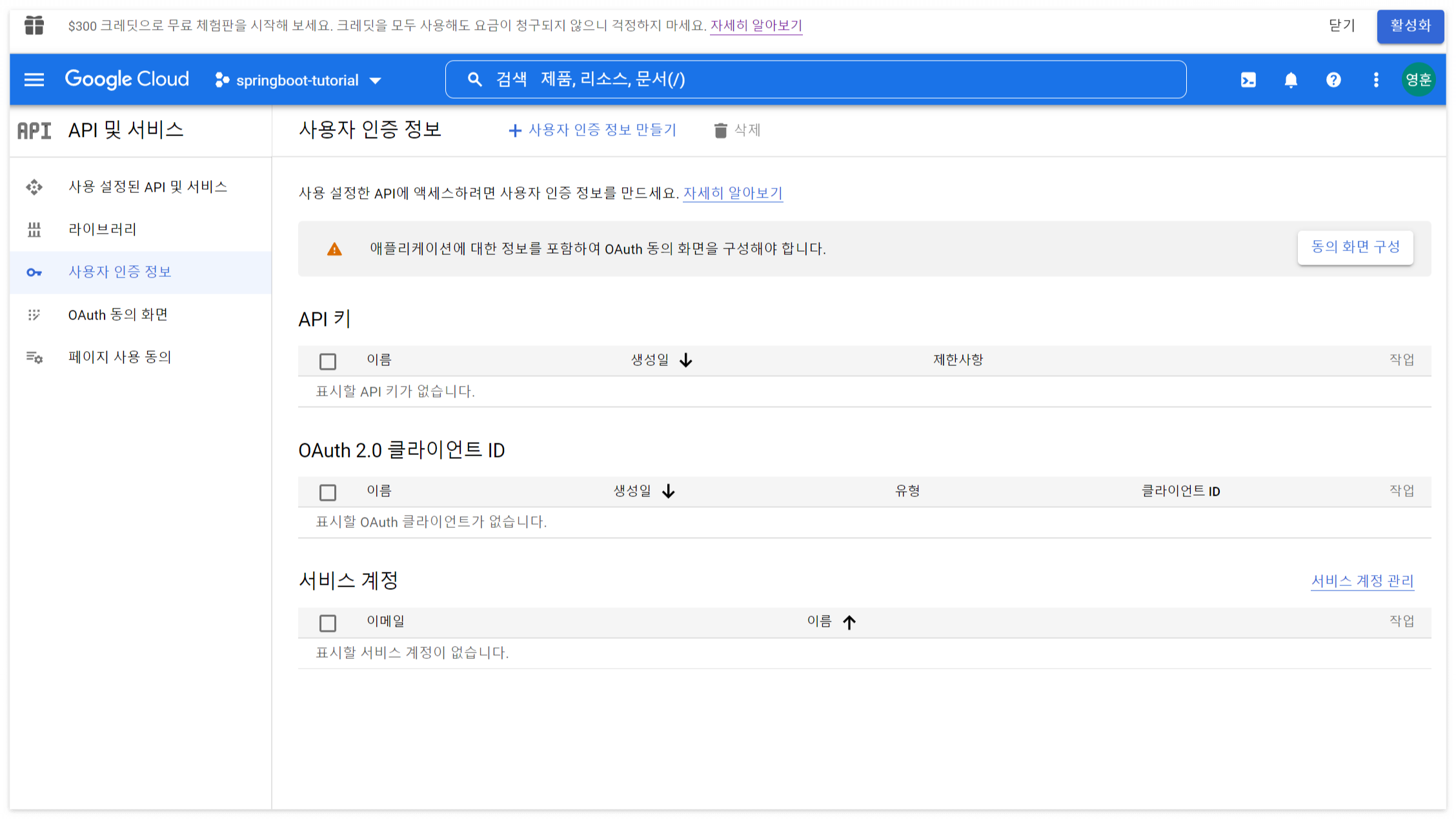 구글을 통한 소셜 로그인 기능을 구현해볼 것이다. 우선 GCP에서 인증 정보를 만들어보자.