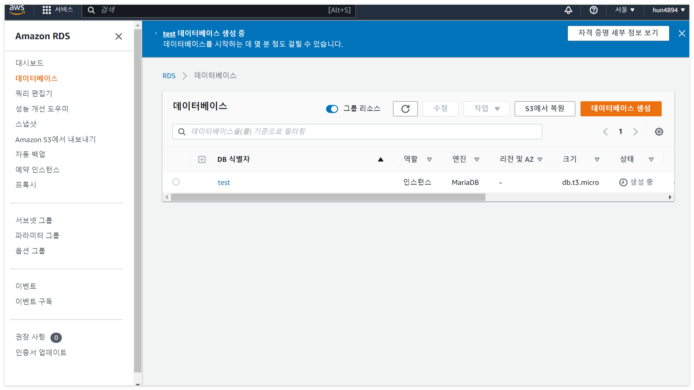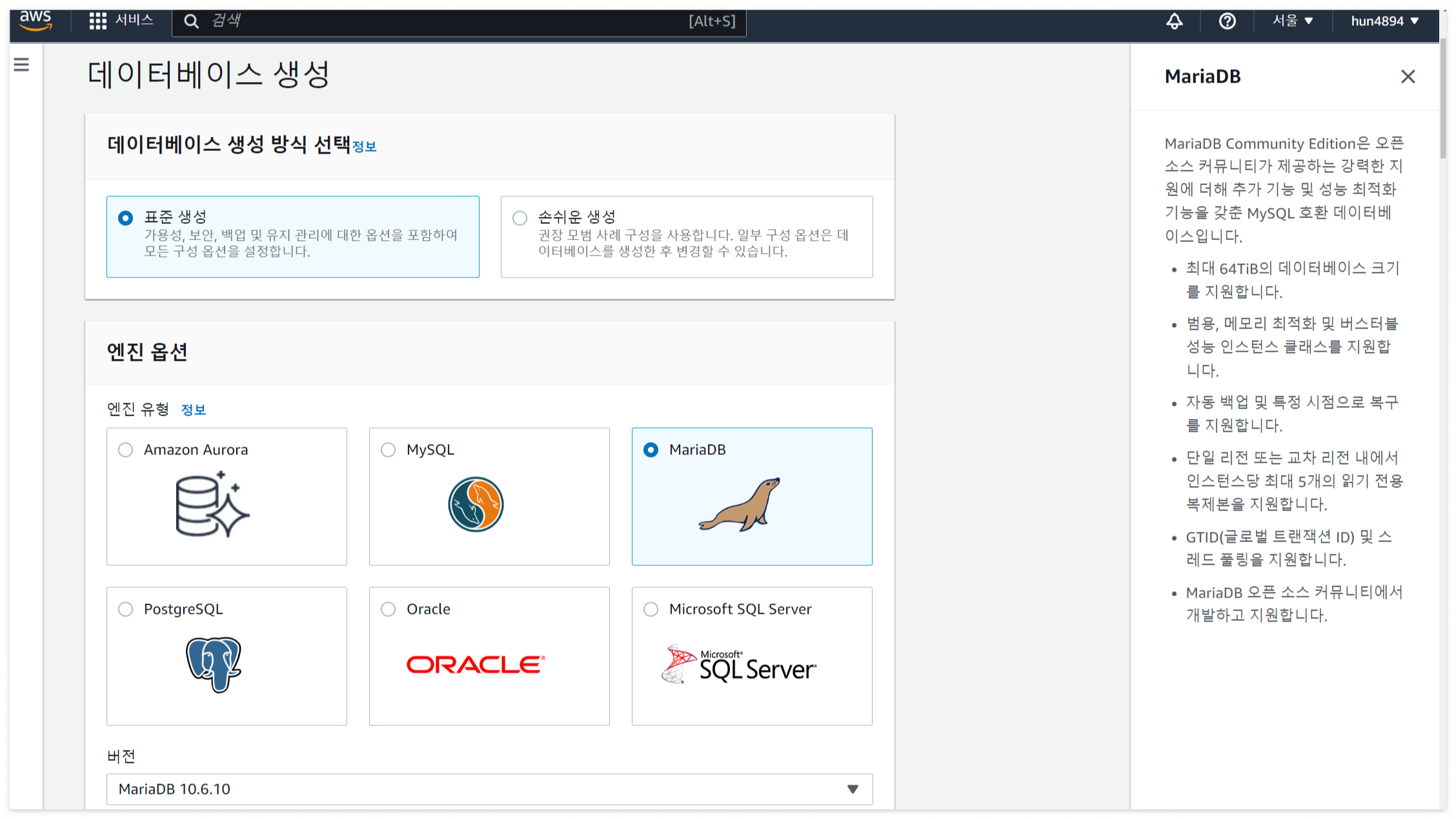 아마존 RDS를 이용해 데이터베이스를 생성할 수 있다. 실습에서는 MariaDB를 활용한다.