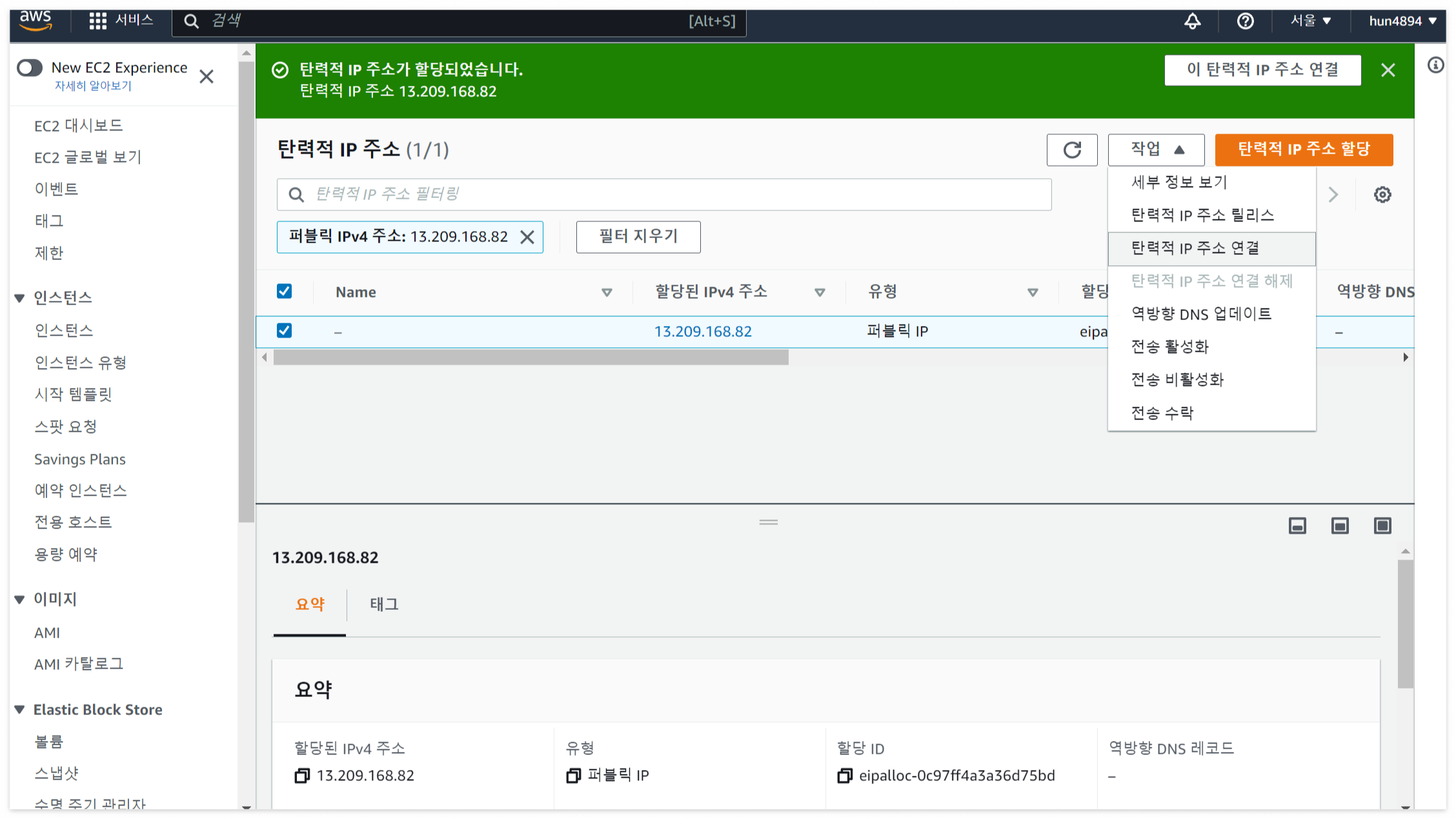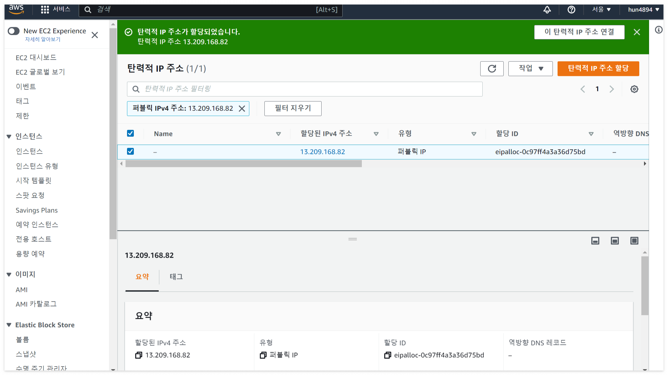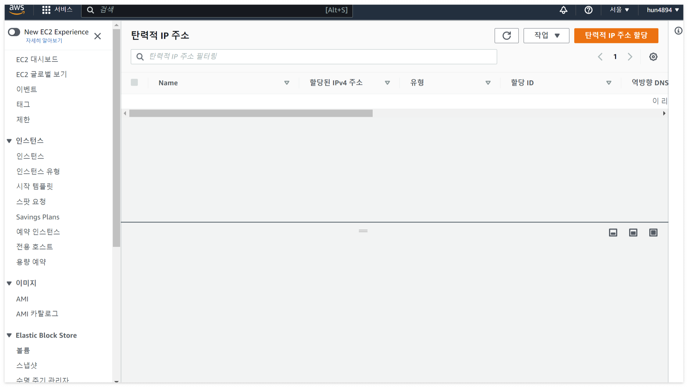 재시작할 때마다 IP가 바뀌는 것은 번거롭기 때문에 EIP(탄력적 IP)를 생성해서 변하지 않도록 한다.