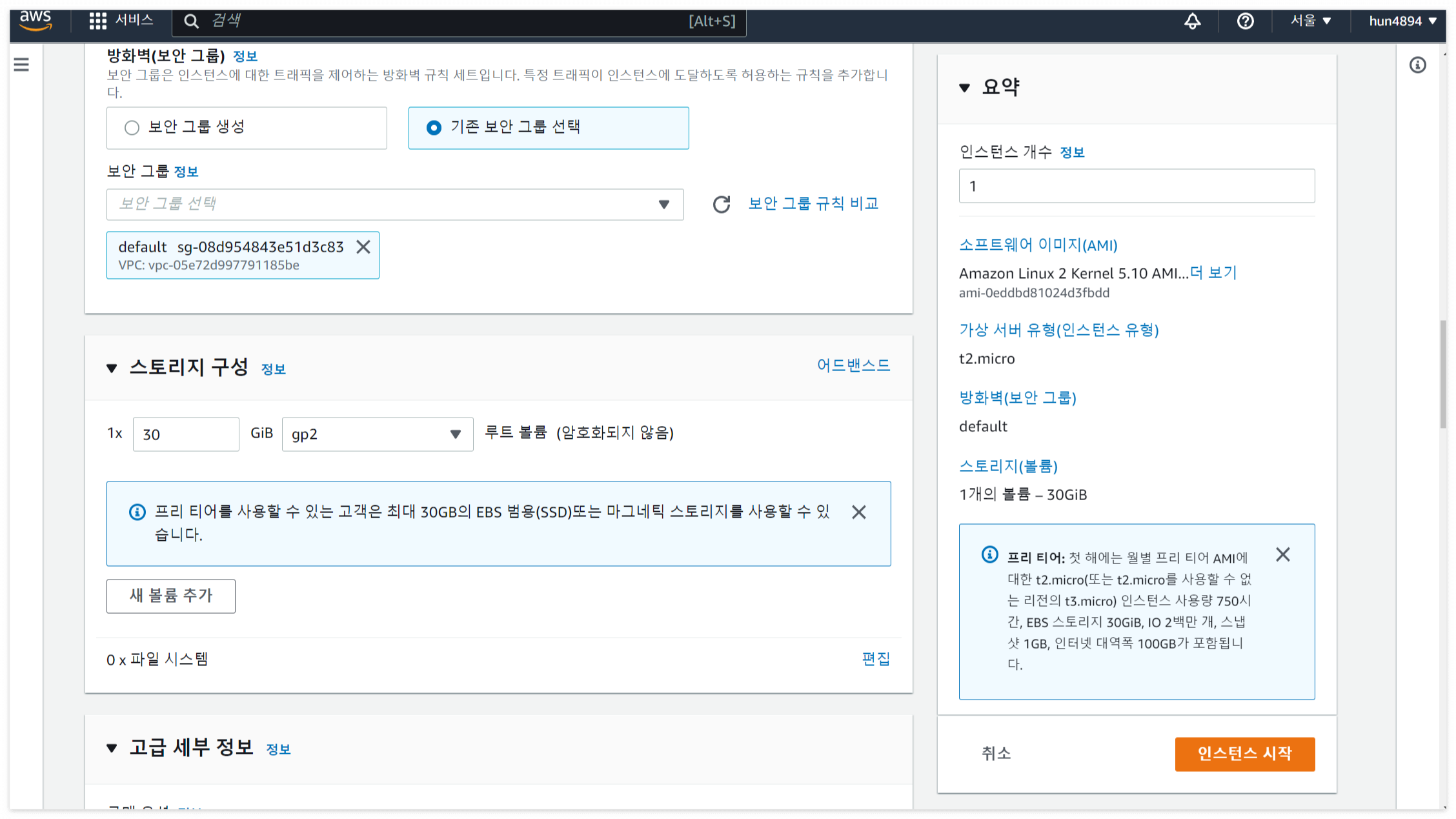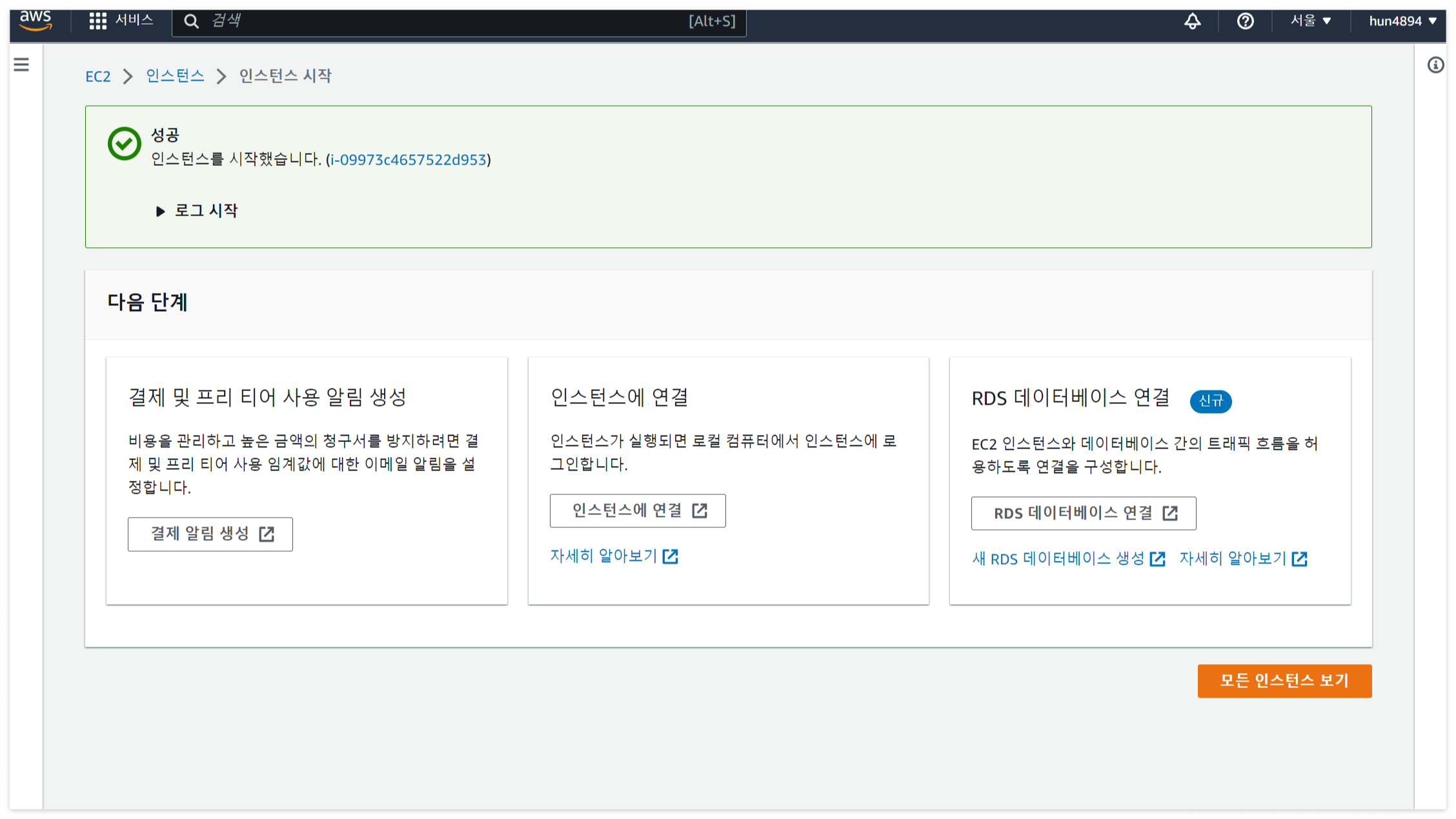 여러가지 설정을 마치고 인스턴스 시작을 누르면 생성이 완료된다.