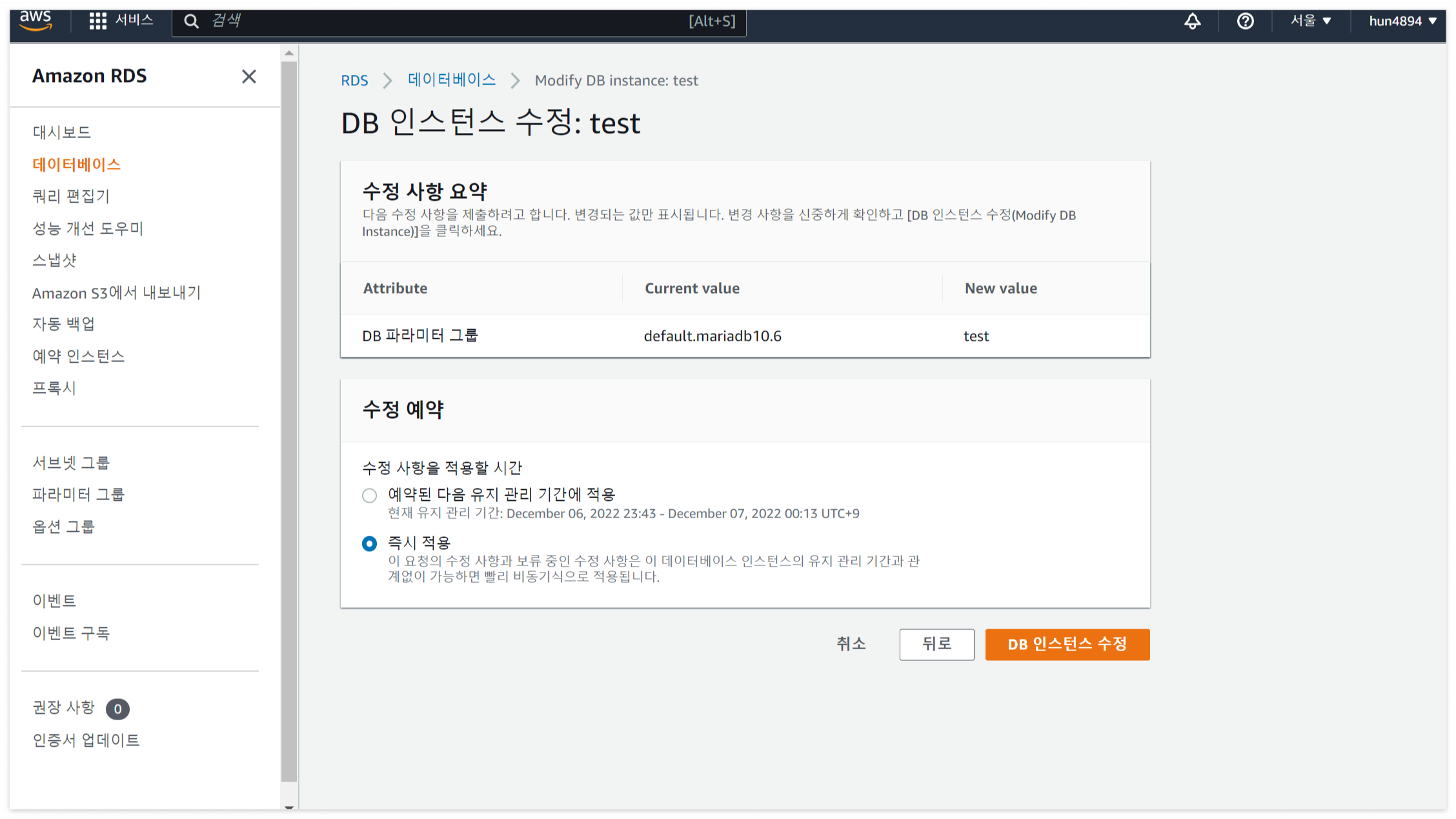 생성된 파라미터 그룹을 데이터베이스에 연결한다.