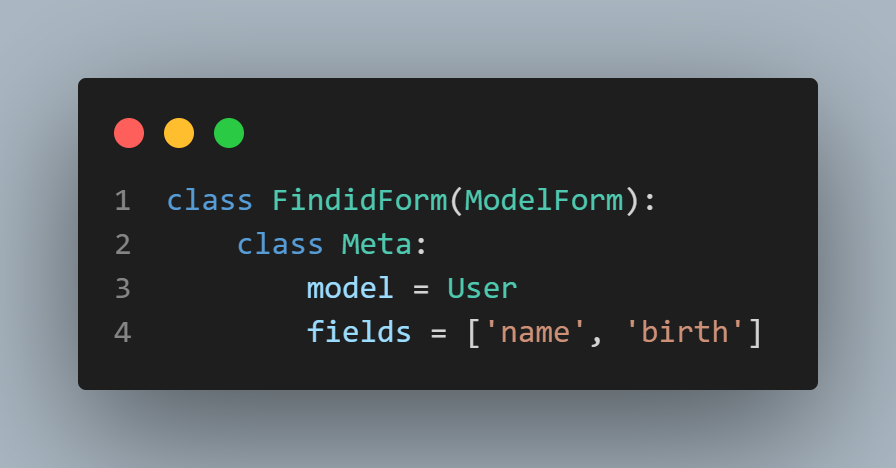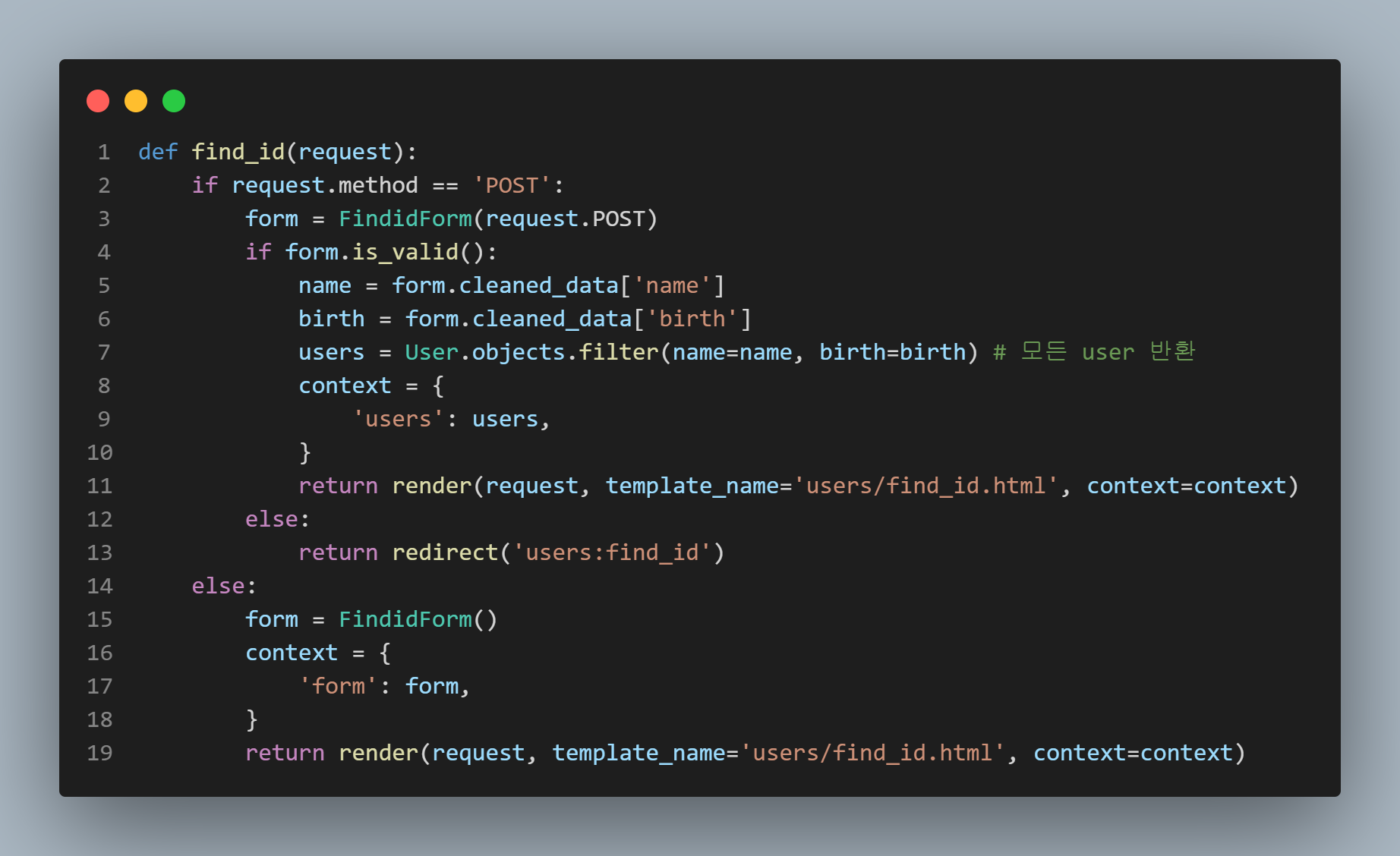 아이디찾기는 form을 만들어서 데이터의 유효성을 편하게 검증할 수 있도록 구현했다. field로 username과 birth를 가진다. 이름과 생년월일을 db에서 필터링해서 모든 계정을 검색하면 된다.