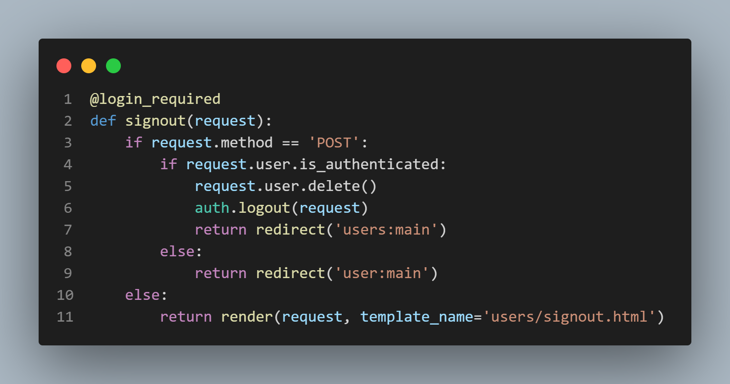 회원탈퇴도 중요한 기능이다. 그러나 타인이 내 계정을 탈퇴시키면 안되기 때문에 로그인한 유저만 자기 계정을 탈퇴시킬 수 있도록 구현했다. 따로 form을 만들 필요는 없고 db에서 지워주기만 하면 된다.