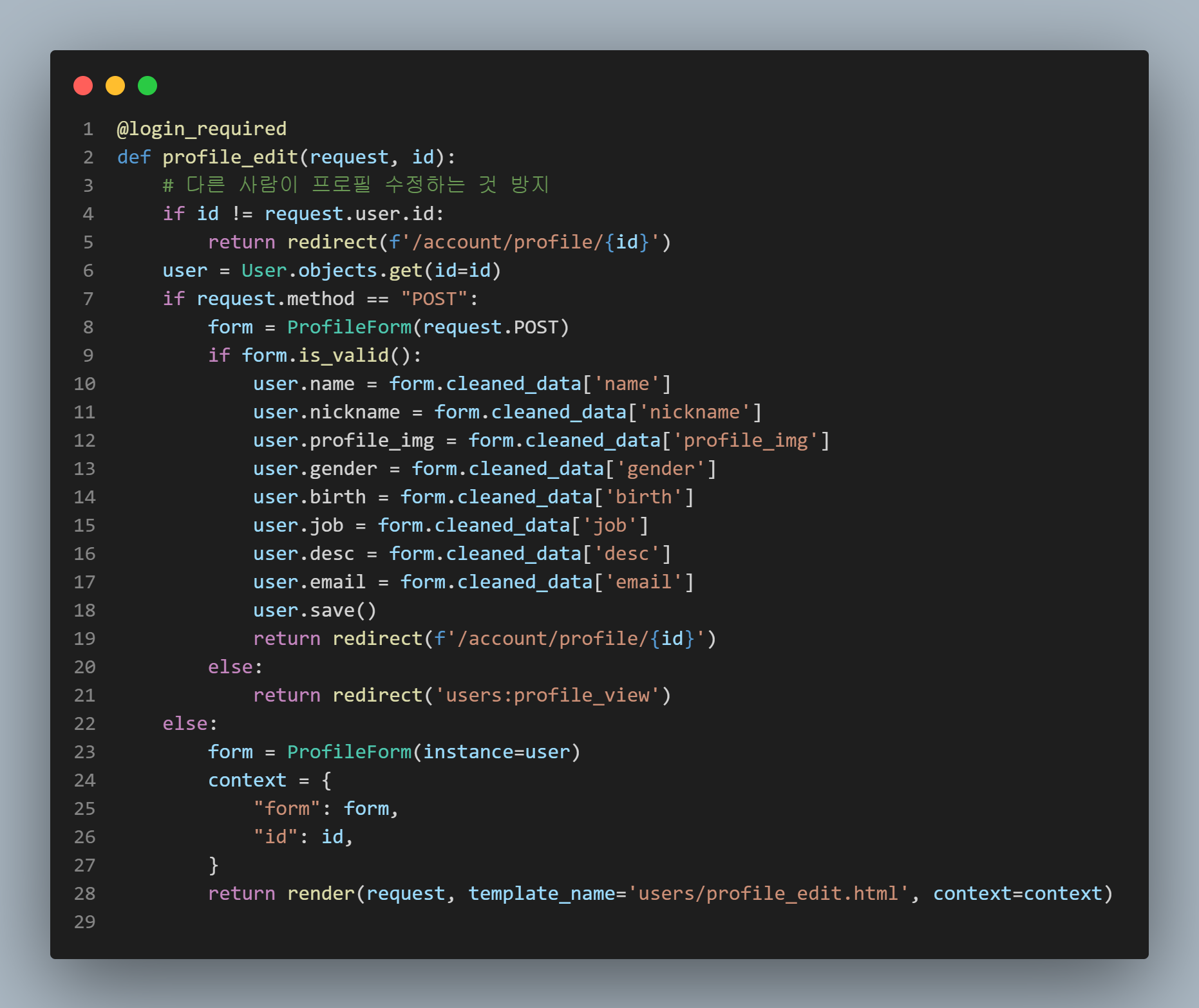 수정할 때 기존의 정보가 담겨져서 나오도록 form을 만들어서 구현했다. 본인만 프로필을 수정할 수 있도록 미리 검사를 하고 다른 사용자가 접근하면 프로필 보기 페이지로 redirect시켜준다.