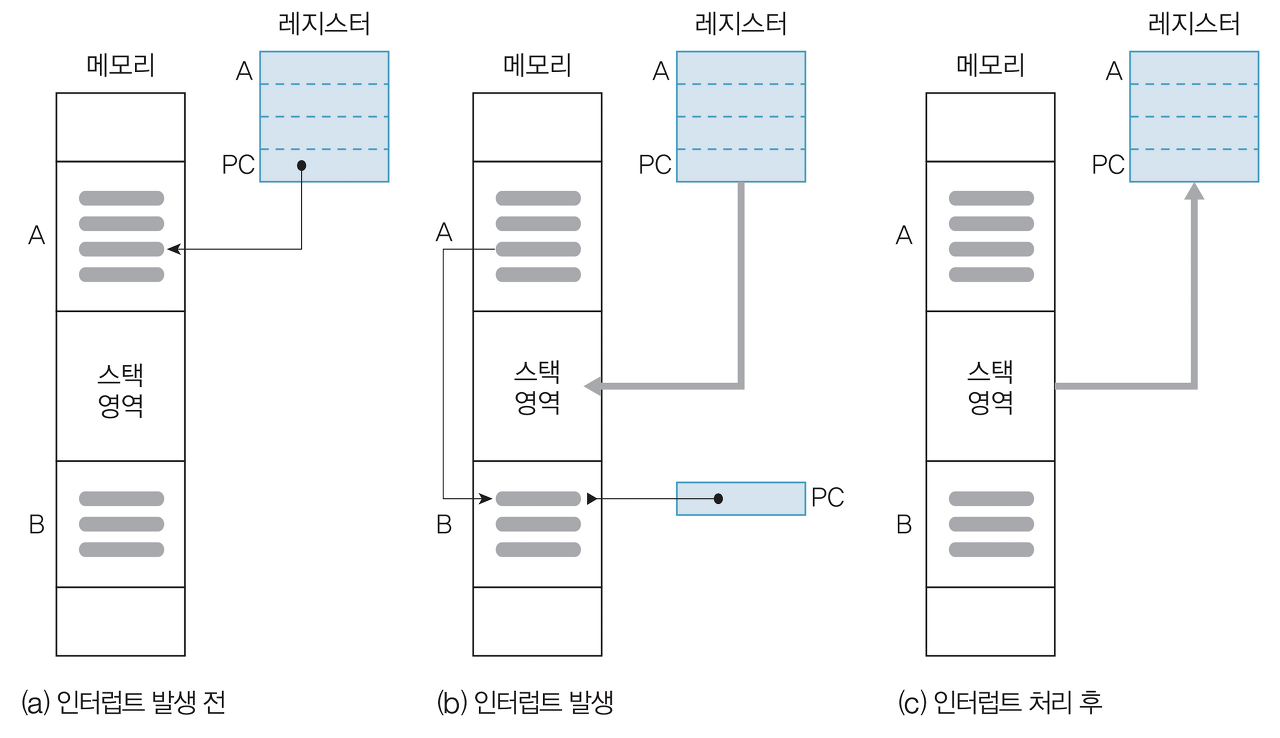 - 프로그램 카운터에 인터럽트 처리 프로그램(인터럽트 핸들러/서비스 루틴)의 시작 위치를 저장