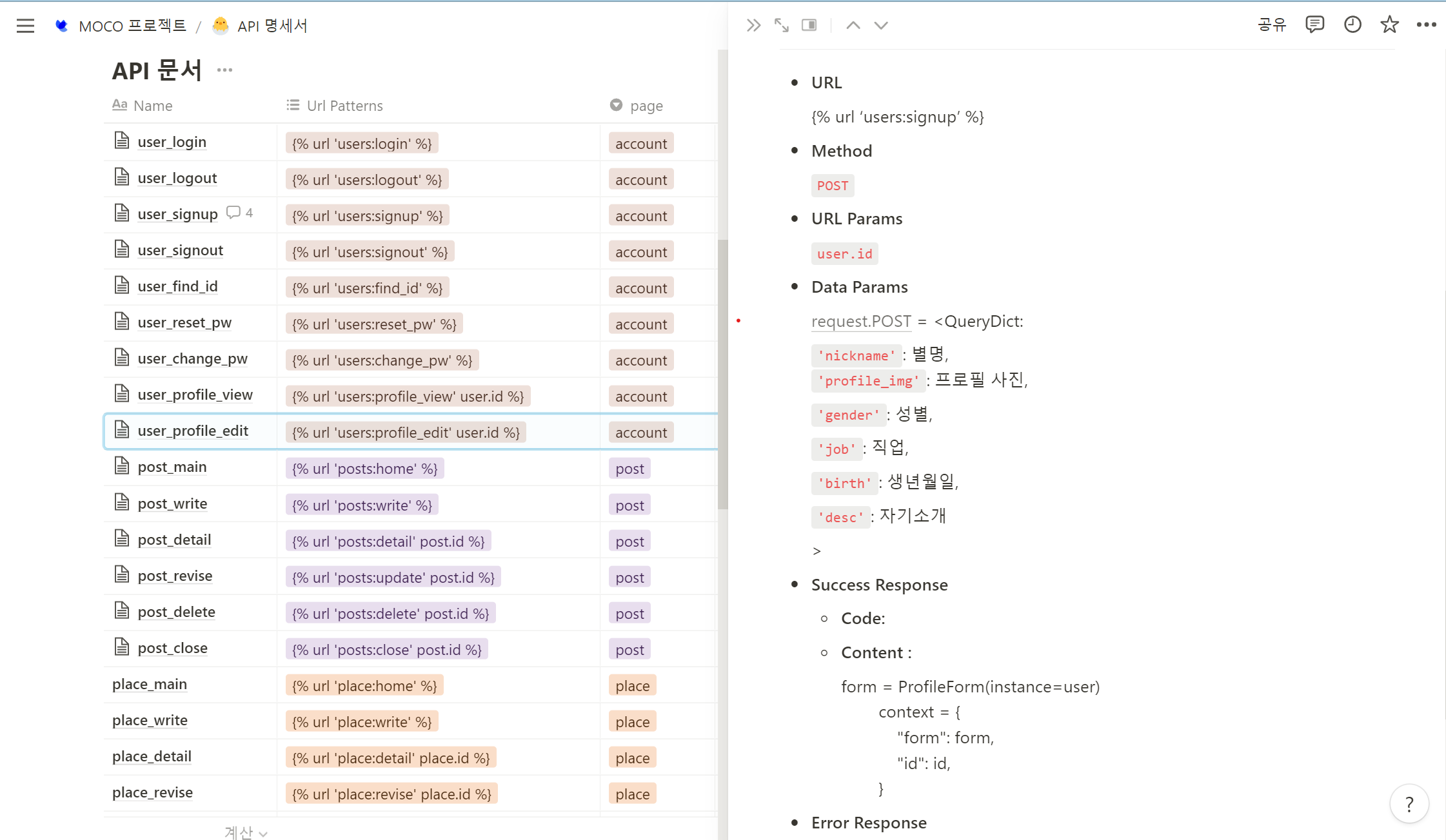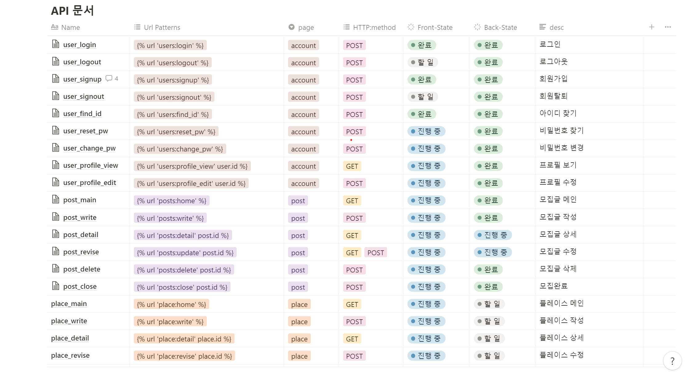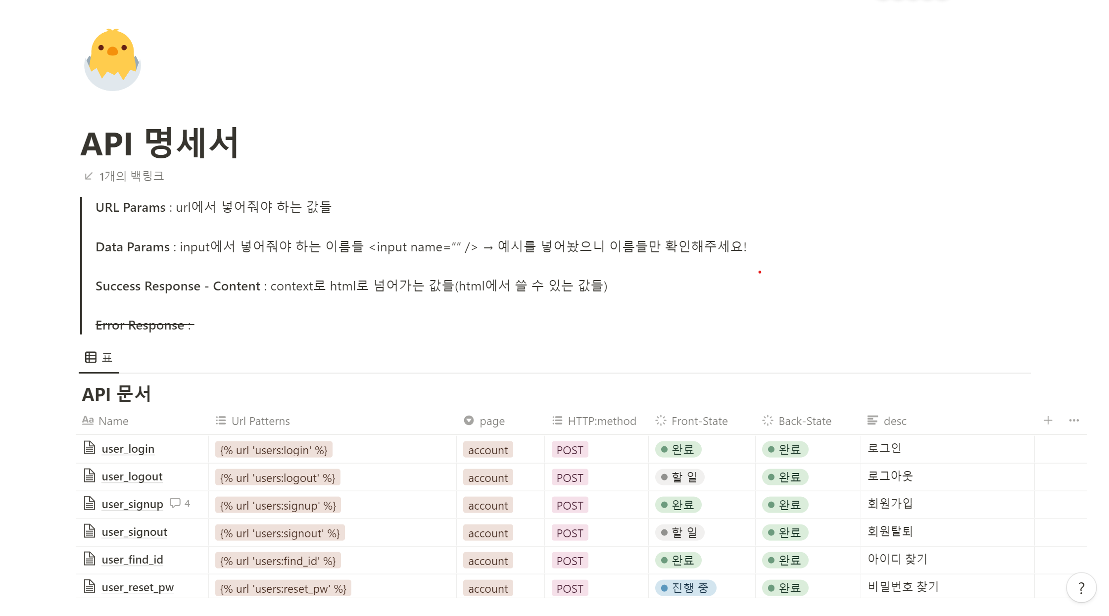 api 명세서를 만든 적 있는 팀원분이 노션에 틀을 제공해주셨고 기능을 만들 때마다 거기에 추가했다.