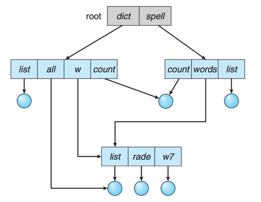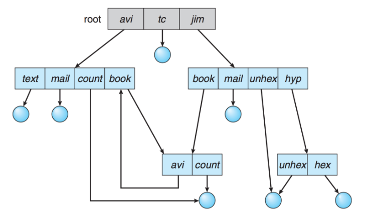 - 디렉터리들이 서브 디렉터리들과 파일을 공유할 수 있도록 한다. 트리 구조의 디렉터리를 일반화한 형태이다.