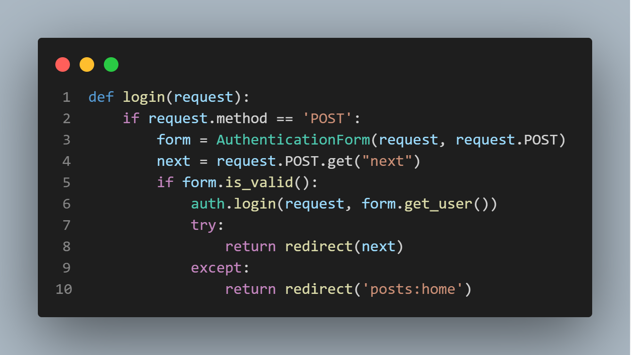 하지만 사용자가 처음 접속한 페이지가 로그인 페이지라면? 그러면 next값이 없을 것이다. (정확히는 'None' 값 들어옴)